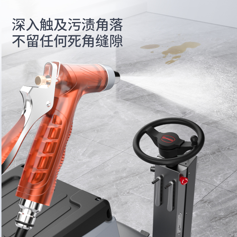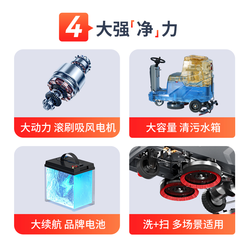小型高效駕駛式洗地機(jī),選配水槍駐車系統(tǒng),大動(dòng)力吸風(fēng)電機(jī),大容量清污水箱,品牌電池持久續(xù)航